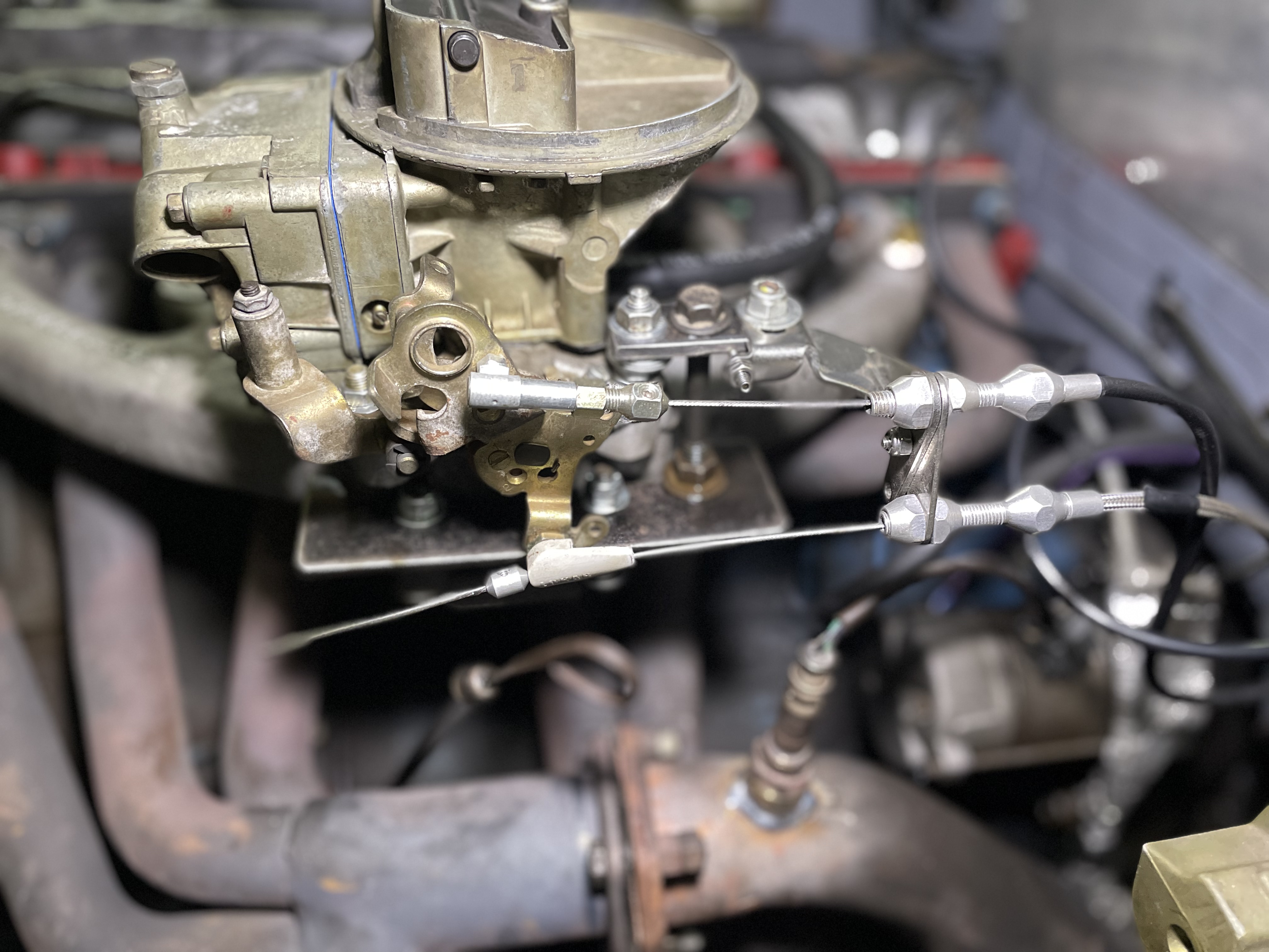 I fiddled around with that derned cold air intake ideer sum more. Wound up cuttin’ the hood, but the air cleaner still hit it. I wound up undoing Adam’s highly sophisticated (that means real smart Cookie) throttle and transmission kickdown mount.