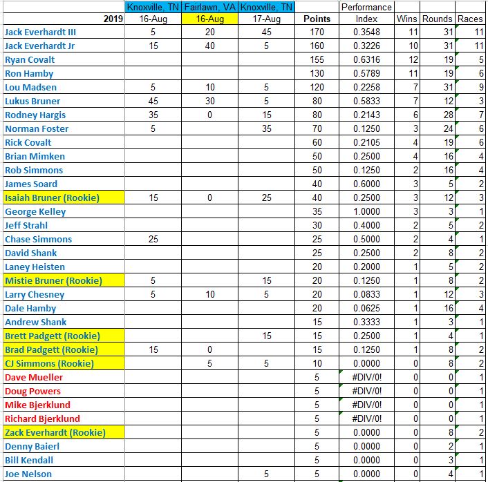 Thanks for the fun rundown, Rob. Congrats to all racers at Knoxville for a fun time and round wins for most (all?) racers. Nice to see some lead changes and several rookies in the mix!
