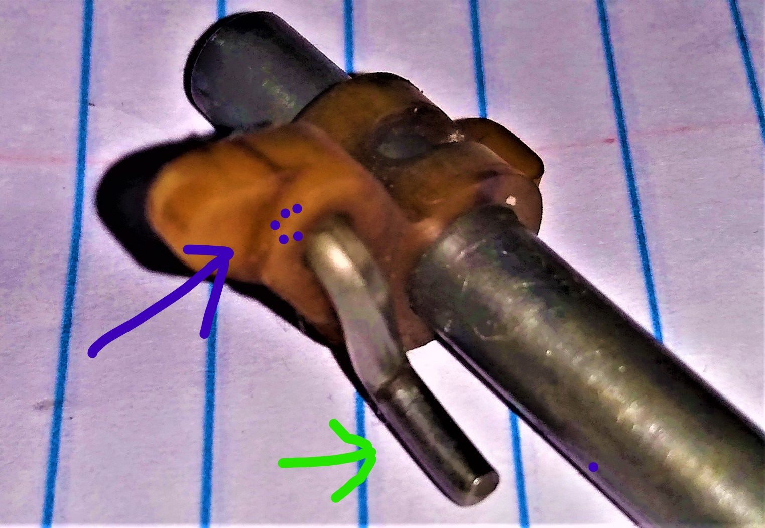 Blue line plastic pump arm can wear or have hair line cracks. Green line wear pattern on steel s pin wear pattern. The s pin mloves in and out of pump shaft with up and down. movement. Check for burrs or smooth with file |