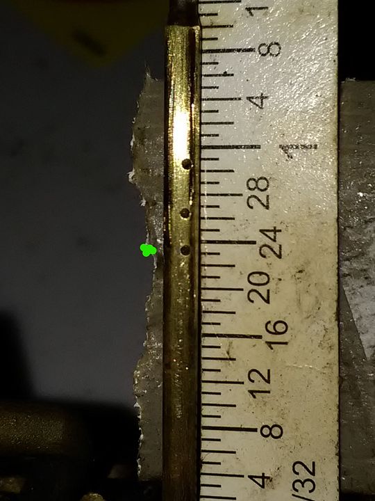 Pictures are upside down and measurements taken with out gasket in place. So take measure of your carb even or close fuel level to top air emulsion hole. Close is good enough. 3/64 down from top of bowl .0470 plus 1/32 .0312, =.0781, Go with 3/32 .1093, put some up ward pressure on the float. That should also lower fuel level. My best guess with todays fuel. |