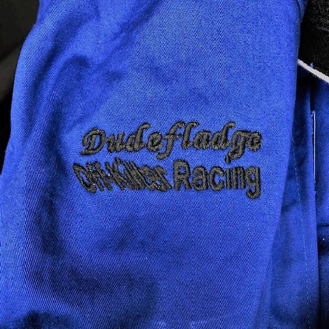I got my racing suit all sewn up with the new bling for the race. :mrgreen: