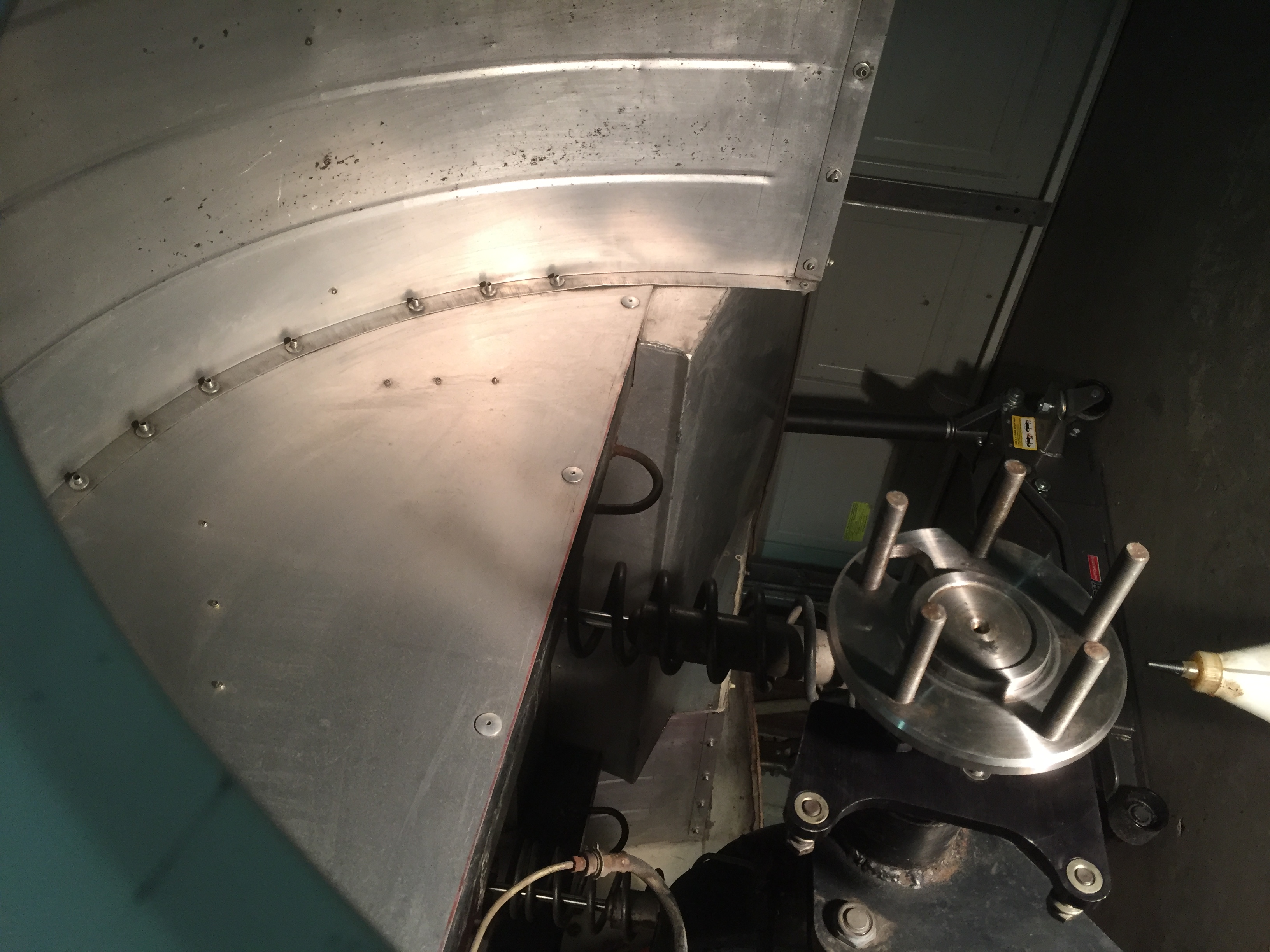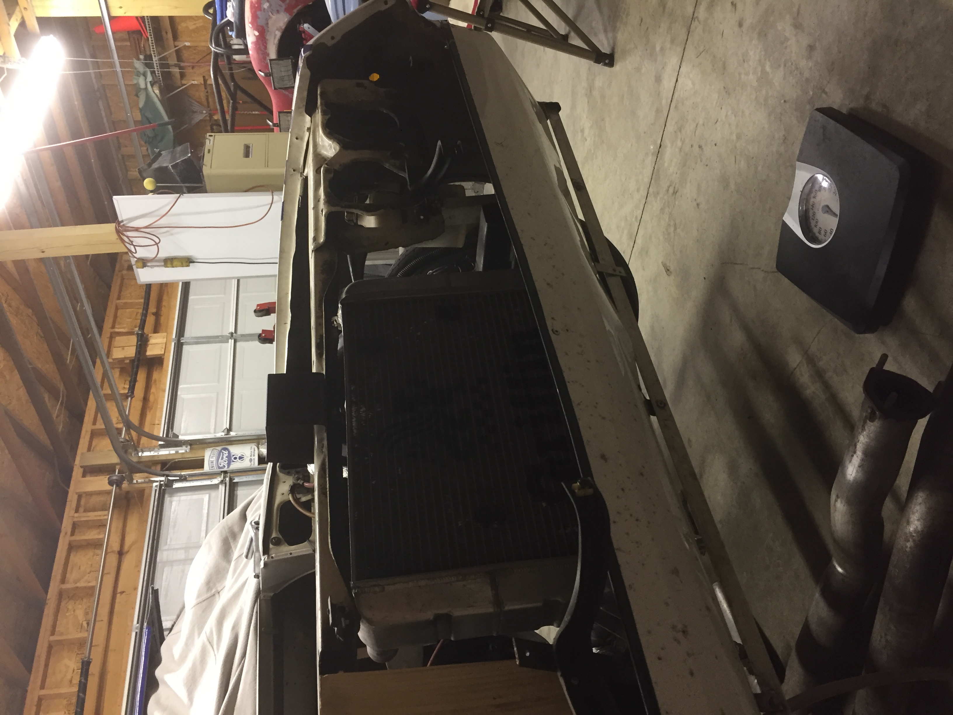 While I still had some time to fiddle I started looking at how I can re-mount the alcohol fuel cell and replace the grill with something better that will seal off the front of the car and offer better aerodynamics. There is also some decent weight savings to be had by removing the grill, brackets and what’s left of the radiator support. I can easily replace the support with lightweight aluminum tube. It only mounts the front of the fenders and grille at this point.