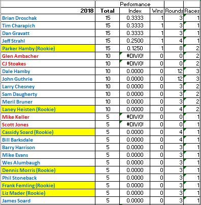 Rookies... I maybe should have checked my numbers before making that prediction... So far we're only at three... I'm confident that number will soar at Clay City, but we won't come close to my prediction of "more than ever before." Back in 2006-2008 we had a big growth spurt for Slant 6 racing with our biggest number of Rookies in 2007 with 43! :shock: 2006 and 2008 both had 33.