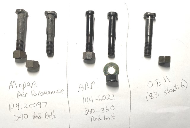 OK, here is a picture of three rod bolts. One is from a Mopar Performance set for a 340 engine. One is an ARP rod bolt for a 340-360 engine. And, finally, one was removed from a 1983 slant six 225 (cast crank). There is practically NO Difference between the various bolts. All weigh the same, about 42 grams with nuts. The Mopar Performance bolt is exactly the same as the slant six one but the nut is slightly taller than the slant six nut. The ARP bolt head is shaped slightly different, head is slightly narrower but also slightly thicker. The ARP nut is as tall as the Mopar Performance nut but it has a flange built in. The shank part of each bolt has no measurable differences. Attachment: Attachment:
