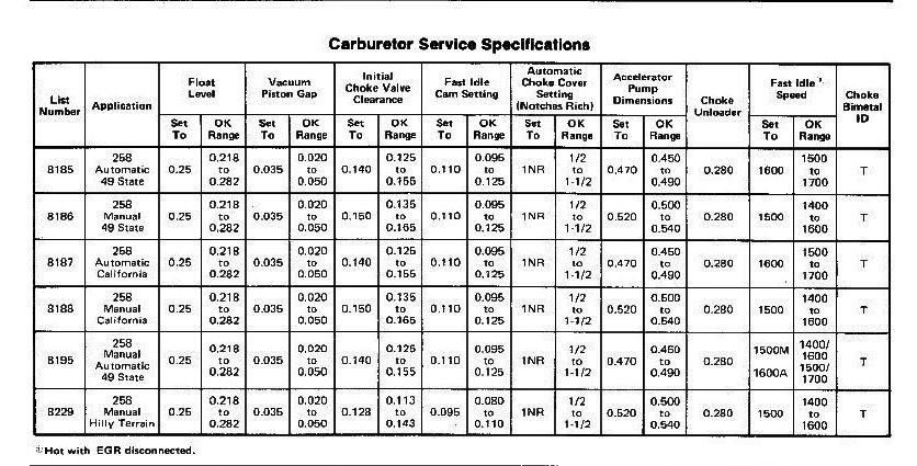 Yeah - I set mine as per the specs in the rebuild kit. The car runs very well (off idles that is) except I was wondering if this adjustment might afford me more fuel when running down the highway. Thanks |