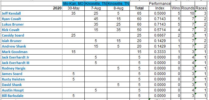 Here are the updated National points after the Clay City race. Next on the docket is the Mason-Dixon race in Boonsboro, MD hosted by the Covalt Clan. Will they have enough to catch that upstart Rookie from Oklahoma...? Tune in the weekend of 9-11 October to find out!