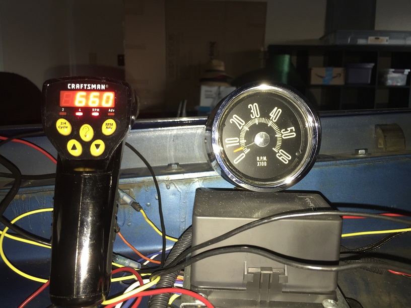 FWIW, I initially tested the tach with it on a table with the face looking up. The needle moved a little at zero with engine at idle and did move at higher RPMs, but not in sync with the timing light. Once I oriented as shown, it began to read more "normally". In this test the sender is getting tach signal from the HEI tach lead, 12v directly from the alternator, and both tach/sender grounded in the engine bay. The tach gets it's signal from the sender and is grounded separately. Once installed, the reading could get slightly more precise as the sender will be attached/grounded to the dash in addition to a separate ground wire and the tach itself grounded and attached to the metal console plate. Thanks in advance for any suggestions anyone cares to offer.