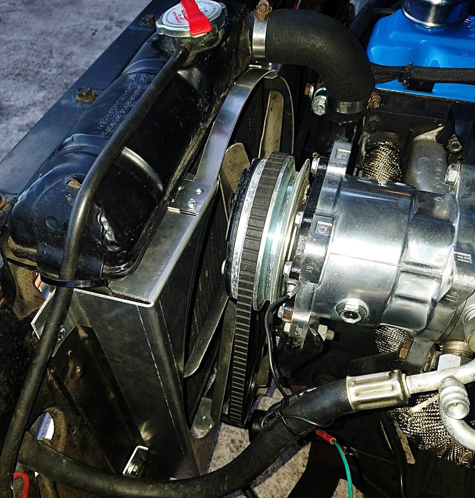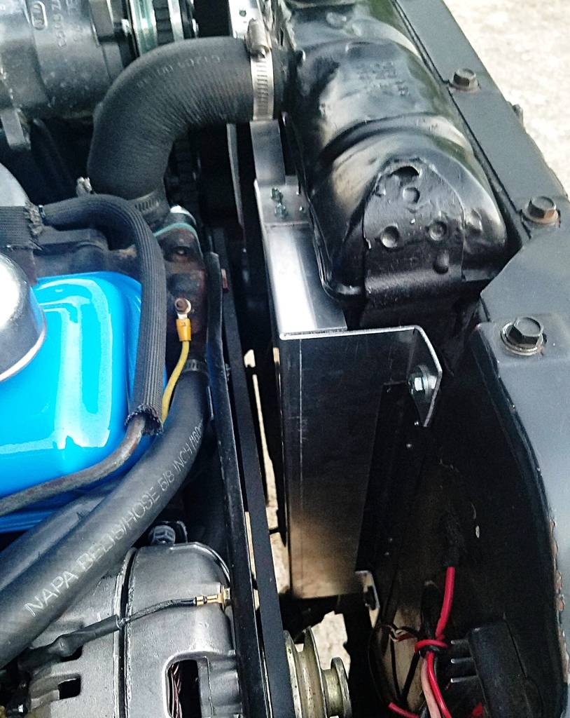 Local sheet metal guy (good dude, but busy with his day job) designed and built this shroud (first one) for my stock 19" radiator in the '61 Lancer with auto trans cooler in the stock radiator.