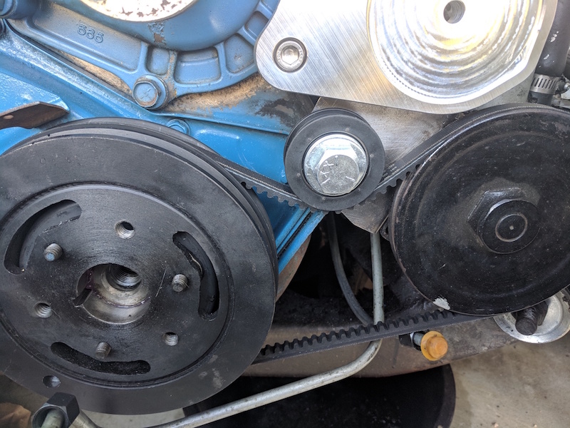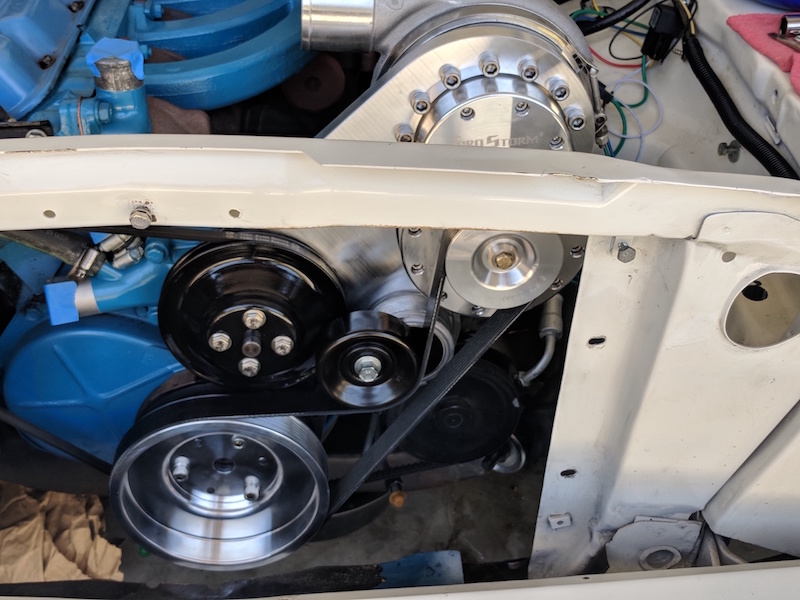 Its been about 2 months since I started installing the Supercharger kit from TorqStorm on my 64 Dart Convertible. I actually started prepping for it in Sept 17 by adding power front disc brakes. Gauges - Tach, Oil Pressure, Trans Temp, Vac/ Boost, and Wide Band O2. A 2.25" free flow exhaust. And a stock 74 electronic ignition. So the kit was great and had lots of instructions. I have also talked with Chris at TorqStorm and he has been very helpful. I have a few challenges because of decisions I made regarding staying with the single barrel manifold and keeping the power steering. I decided to use a Weber 32/36 DGEV progressive 2 barrel for the blow thru application. This required a small adapter and then I fabbed some brackets to use the stock linkage. Unfortunately it was too tall so I needed to replace the hat and tubing that came with the kit. The supercharger uses the PS pulley position, so I sourced the back pulley used by AC, which I don't have, and added an idler pulley to clear the supercharger bracket. The other issue with the power steering was that the box blocked where the kit wanted to put the intake. So I moved the battery to the trunk and am fashioning a CAI. I also put a nipple on the fuel pump atmospheric port to see if it will handle the boost reference and upgraded to a 3 row aluminum radiator. Everything fits with some pretty tight tolerances. I have it mostly installed and plan to fire it up in a few weeks. Wish me luck (hopefully good, haha).