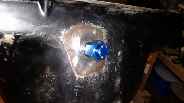 John, I welded a piece of steel plumbing pipe to my pan (3/4 NPT). For the return line, you just need a large diameter hose that can withstand the heat near the turbo exh housing, and there is very little pressure. I bought a cheap tapered (AN-NPT) adapter fitting at a hose supply place to make an adapter but you could also just use NPT fittings and hose clamp the hose on. Depending on the car, you may want to go forward from where I have mine. I did one for a 64 Valiant and it ran into the steering box mount a little, so further forward might be good. That pan is currently on the LeMons racecar, so I can't look at it now. Also, where do you plan to put the turbo? That will determine somewhat where you put the drain line fitting in the pan. You want the drain line to be as vertical as possible. Hope this helps, Lou |