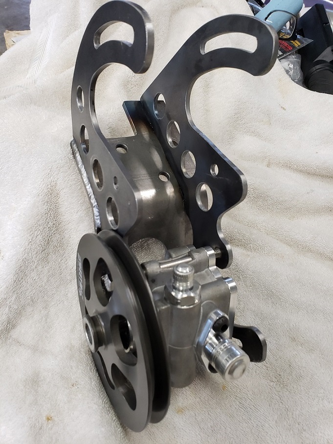 The bell is the QT one I modified for the 10.5" clutch / 130 tooth 30lbs Schiefer flywheel. I also had to add the mounting tab for the column shifter linkage lol. The clutch is the basic McLeod 75109 diaphragm type. As it sits, I could remove the 904 and install an 833 without touching the bellhousing forward. The engine-bell bracket was graciously donated by Rob! The 904 is actually a 998 and I used most of the usual HP parts as well as turning the TC feed passage into a 7th pump bolt. The front pump is no longer there...I use the KRC pump driven off the crank. The original PS pump had to move up to make room so I switched to a Saginaw PS pump while I was at it. The trans is 3" rearward compared to stock so the driveshaft had to be cut accordingly.