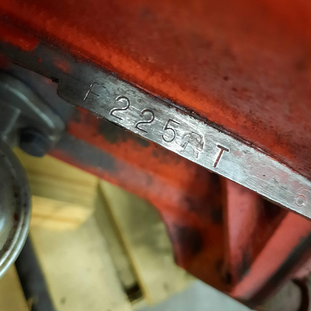 I searched around for a breakdown of all the codes for the number on the boss under the alternator but could only find posts of people asking what their number meant and people answering them. Is there a chart online? If not I could use some help with mine as it seems to have letters where people have numbers. F225R T long space 6 The R looks a little funny it's lighter and maybe stamped over something. Picture wouldn't upload, said it was too big and don't know how to resize on my phone. I can always email it you of you'd like. The engine was said to come out of an airport tug. From what I've read the F means 1970 right?