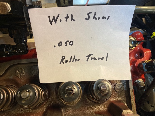 Concerning the changes in lift, I wish I had thought of that, the roller rockers and spacers are in place, I already did an install and remove and re install and remove again to get the valve tip to roller travel photos. I am satisfied with seeing the reduction in roller travel and knowing the pressure on the valve stem is centered. It would be interesting to see the change in lift and I would do that if I have the rockers out of the head in the future.