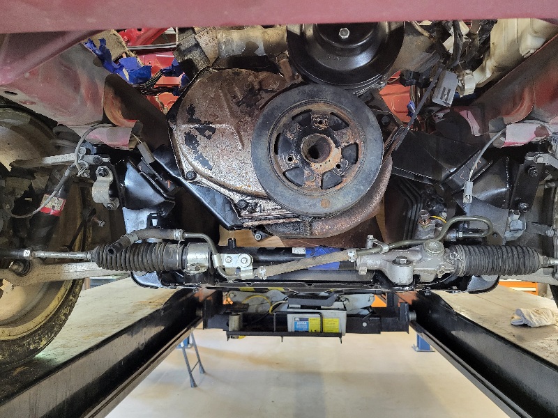 OK, after being busy and having to figure out how to resize these images to where they will post here, I have the slant in the 2004 RX8 with a 2 3/16 plywood adapter and the new motor mounts on the RX8 front subframe and the Miata hydraulic rack installed.