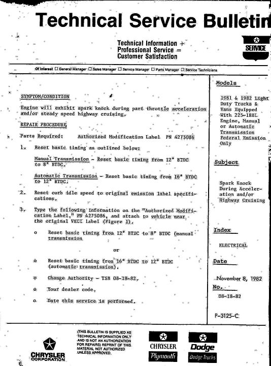 I have a 1982 dodge d-150 slant 6. What ignition system do you have perhaps lean burn, there was service bulletin about this issue. Will check my library Memory may be bad.