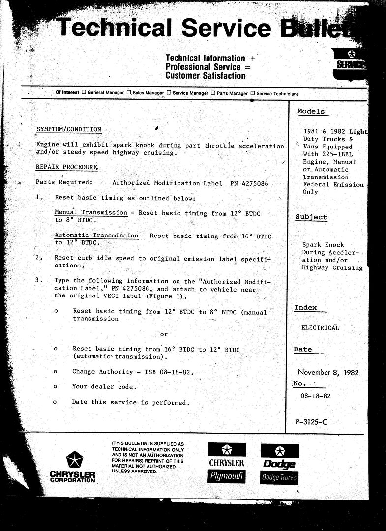 I have a 1982 dodge d-150 slant 6. What ignition system do you have perhaps lean burn, there was service bulletin about this issue. Will check my library Memory may be bad. |