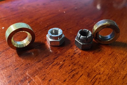 The one on the left is aftermarket, the nut is straight (no taper) and the washer has a bevel in the center for the nut.