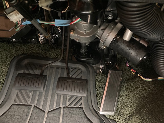 The power unit is just above the top of the gas pedal. I have the drive side seat out to make access easier. I reinstalled the seat and verified that the location of the power unit will not interfere with foot access to the go pedal.