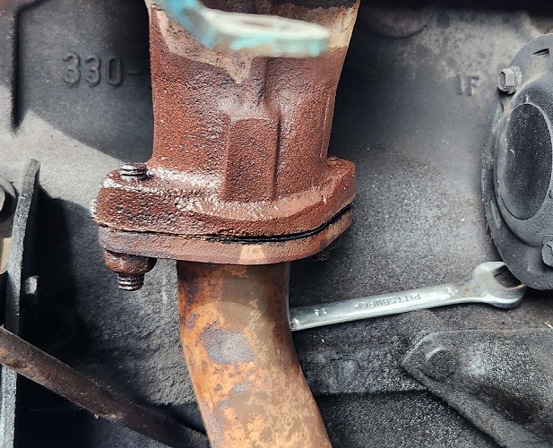 But of all of the exhaust bolts on the engine (pipe flange, bolts that hold the manifold to the engine, bolt/studs that hole the manifolds together) the ones that hold the pipe to the manifold are the ones that if they broke, and if you drilled them and were "off" and wrecked the threaded holes, those are "open" on top where you could use a nut on the top side in place of the threads in the manifold. And open so you could get some heat on the ears of the flange to help work them loose. And a little propane hand held bottle torch won't touch it. The same setup with a mapp bottle has a better chance, but you really need a big oxy acetylene setup to make a dent.